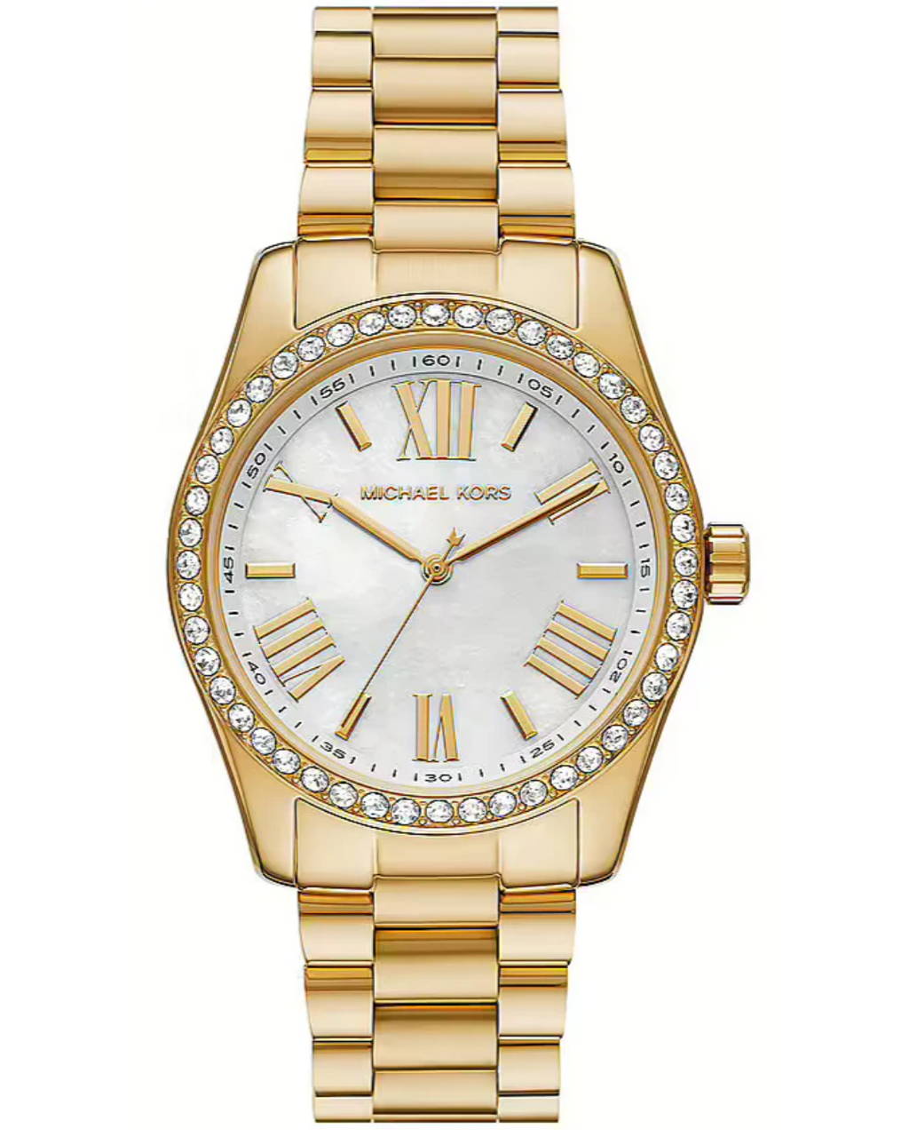 lexington mother of pearl white dial gold steel strap watch for women - mk1079
