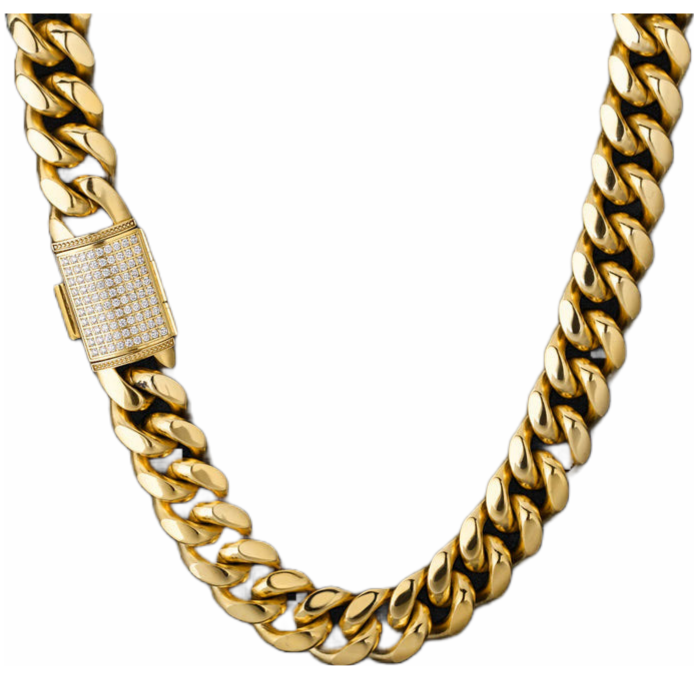 Introducing the Big Daddy 18mm All Gold Diamond Clasp Cuban Chain! This exquisite piece of jewelry is the epitome of luxury and style. It comes with safety clasps and has fine craftsmanship, making it a stylish hip-hop jewelry item. Perfect for everyday wear or special occasions, this versatile piece will make a lasting impression. Upgrade your jewelry collection today!
