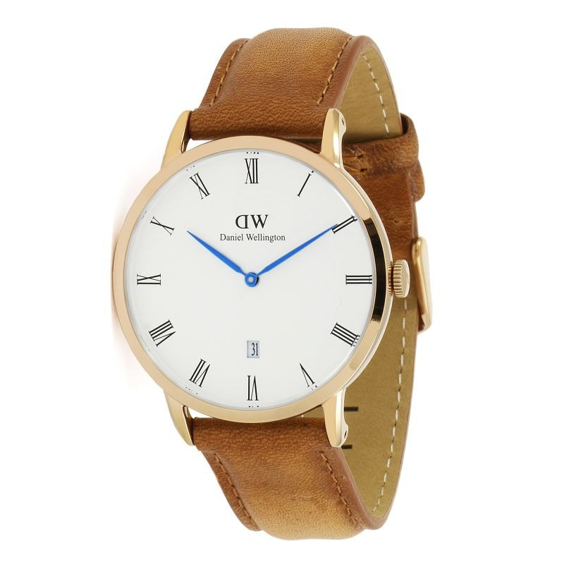 This Daniel Wellington Dapper Durham 38mm Men's Gold Watch DW00100115 comes in rose gold-tone stainless steel case with a light brown leather strap. Fixed rose gold-tone bezel. Eggshell white dial with blue hands and Roman numeral hour markers. Dial Type: Analog. Date display at the 6 o'clock position. Quartz movement. Scratch resistant mineral crystal. Pull / push crown. Solid case back. Case size: 38 mm. Case thickness: 7 mm. Round case shape. Band width: 19 mm. Tang clasp. Water resistant at 30 meters / 100 feet. Functions: date, hour, minute. Casual watch style.