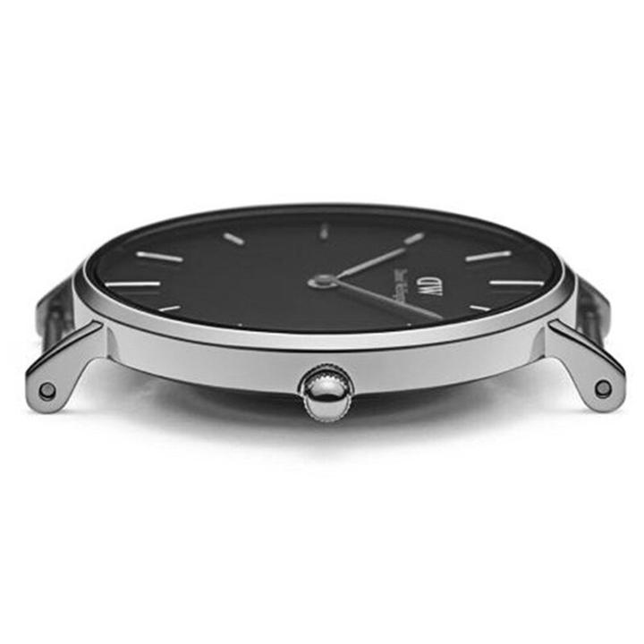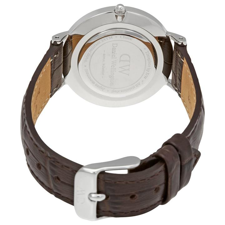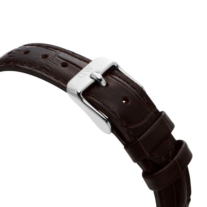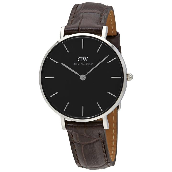 This Daniel Wellington York 28mm Women's Silver Watch DW00100182 comes in stainless steel case with a dark brown leather strap. Fixed stainless steel bezel. Black dial with silver-tone hands and index hour markers. Dial Type: Analog. Quartz movement. Scratch resistant mineral crystal. Pull / push crown. Solid case back. Case size: 28 mm. Case thickness: 6 mm. Round case shape. Band width: 14 mm. Tang clasp. Water resistant at 30 meters / 100 feet. Functions: hour, minute. Casual watch style.