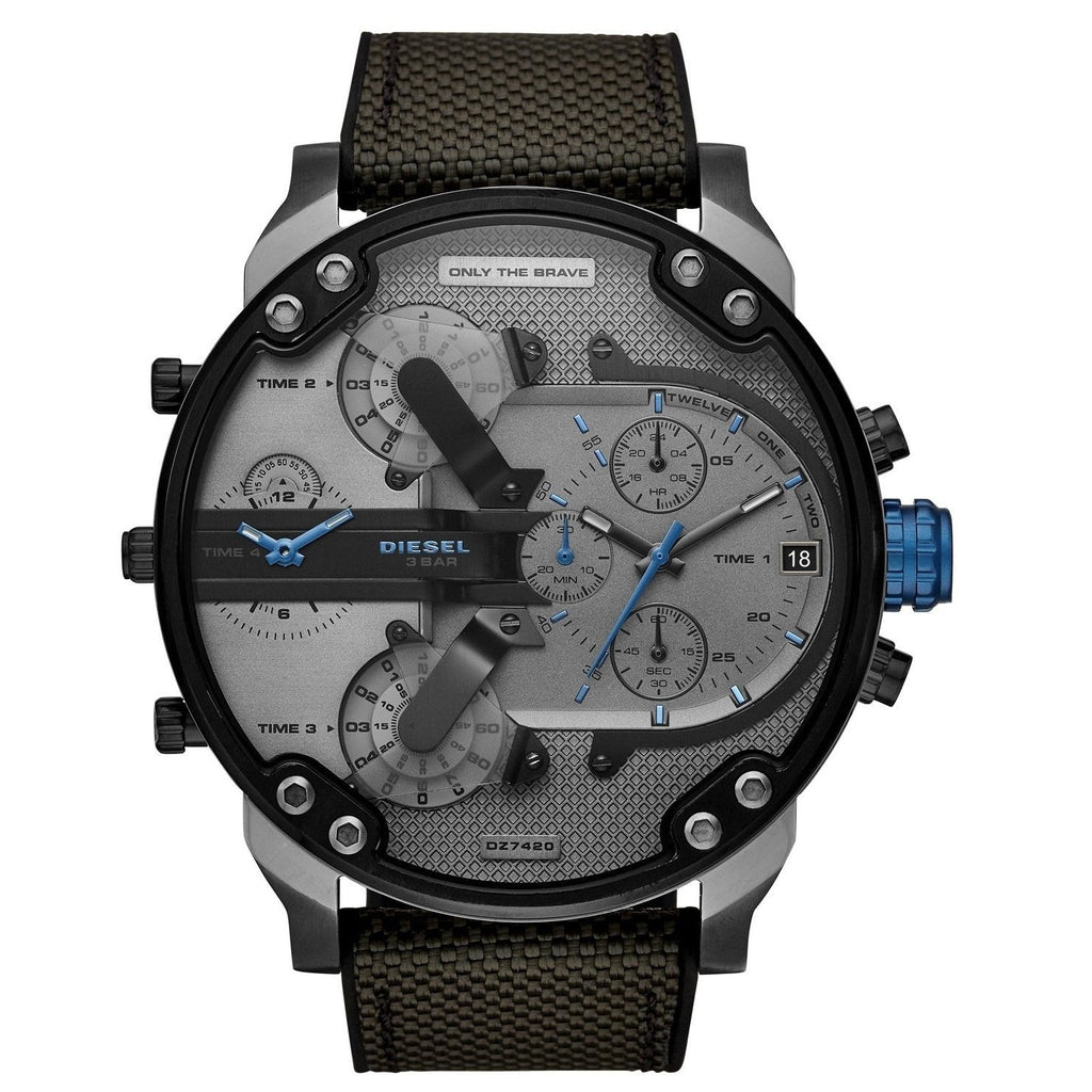 This 57mm Diesel Big Daddy DZ7420 features a detailed gray dial with blue accents, chronograph movement and black-and-gray silicone and nylon strap. Among many more features.