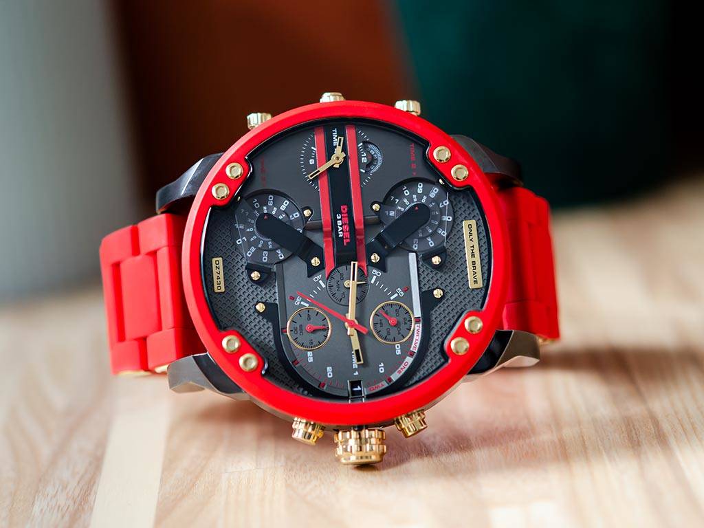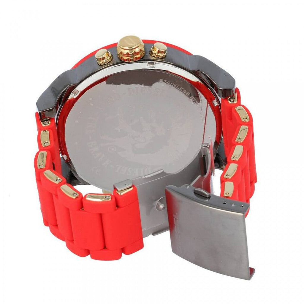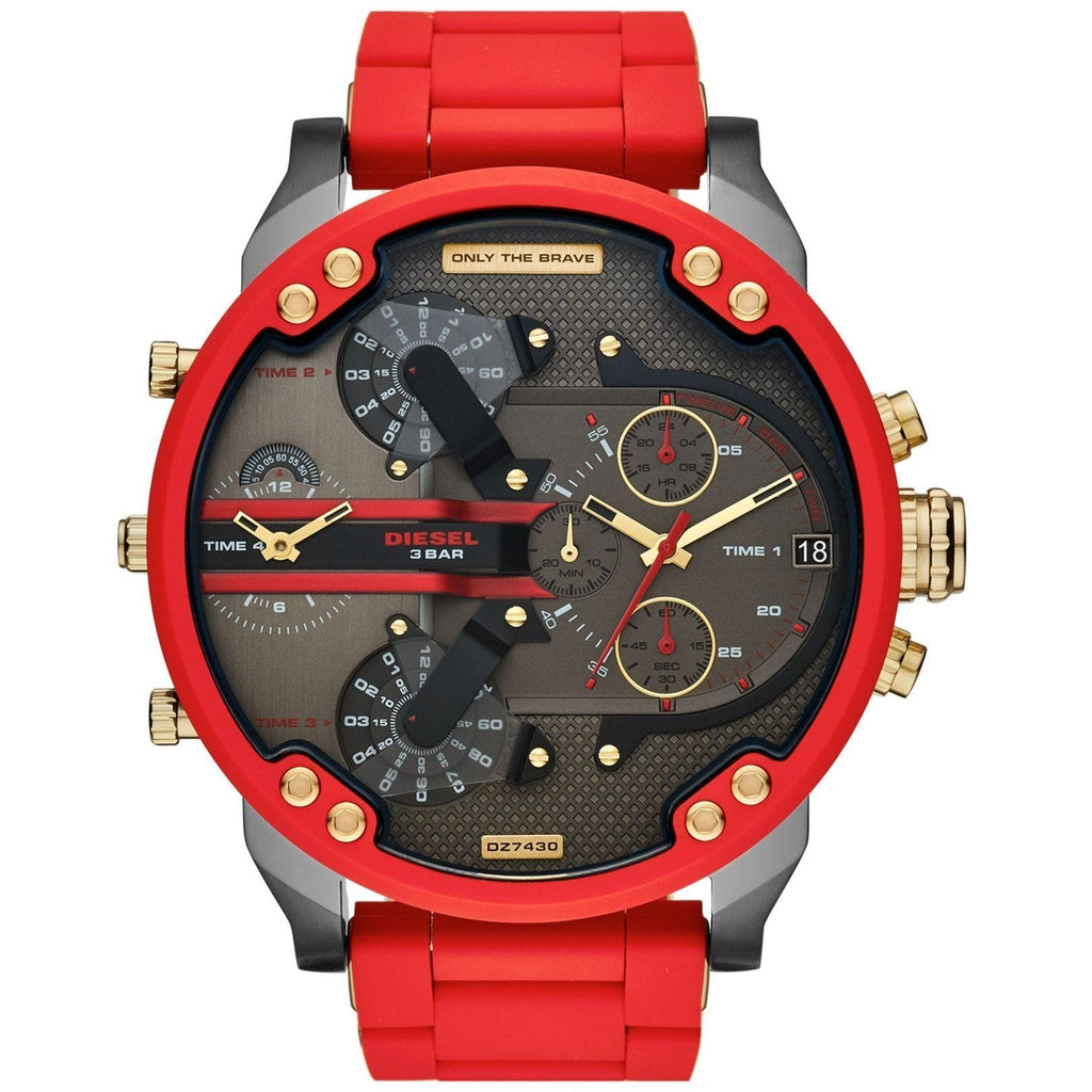 This 57mm Diesel Big Daddy DZ7430 features a gray brushed dial, chronograph movement, and a red silicone-wrapped stainless steel bracelet. Among many more features.