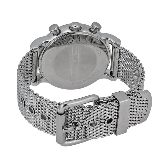 Stainless steel case with a stainless steel mesh bracelet. Fixed stainless steel bezel. Black dial with silver-tone hands and index hour markers. The Emporio Armani logo at the 12 o'clock position. Dial Type: Analog. Luminescent hands. Date display between the 4 and 5 o'clock positions. Chronograph - three sub-dials displaying: 60 seconds, 30 minutes, and 24 hours. Quartz movement. Scratch-resistant mineral crystal. Pull/push crown. Case diameter: 41 mm. Case thickness: 12.3 mm. Bracelet width: 20 mm. Round case shape. Tang clasp. Water-resistant at 50 meters / 165 feet. Functions: chronograph, date, hour, minute, second. Casual watch style. Emporio Armani Classic Chronograph Black Dial Steel Men's Watch AR1811.