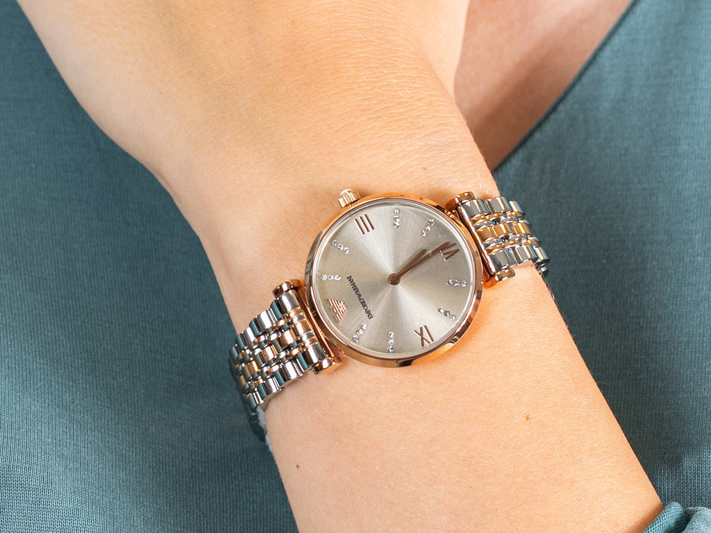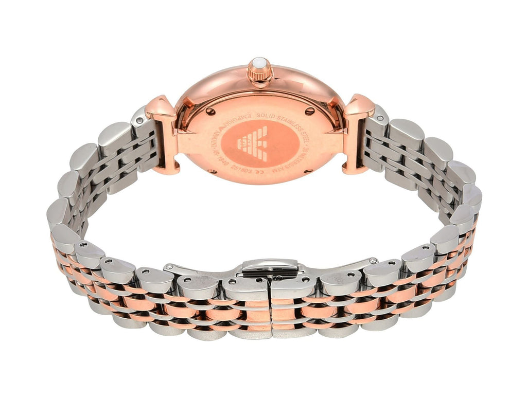 This Emporio Armani Classic Grey Dial Ladies Watch AR1840 comes in rose gold-tone stainless steel case with a two-tone (silver and rose gold-tone) stainless steel bracelet. Fixed rose gold-tone bezel. Grey dial with rose gold-tone hands and crystal-set index hour markers. Roman numerals mark the 3, 6 and 9 o'clock positions. The Emporio Armani logo appears at the 12 o'clock position. Dial Type: Analog. Quartz movement. Scratch resistant mineral crystal. Pull / push crown. Solid case back. Case size: 31 mm. Case thickness: 7.5 mm. Round case shape. Band width: 14 mm. Deployment clasp. Water resistant at 30 meters / 100 feet. Functions: hour, minute. Casual watch style.