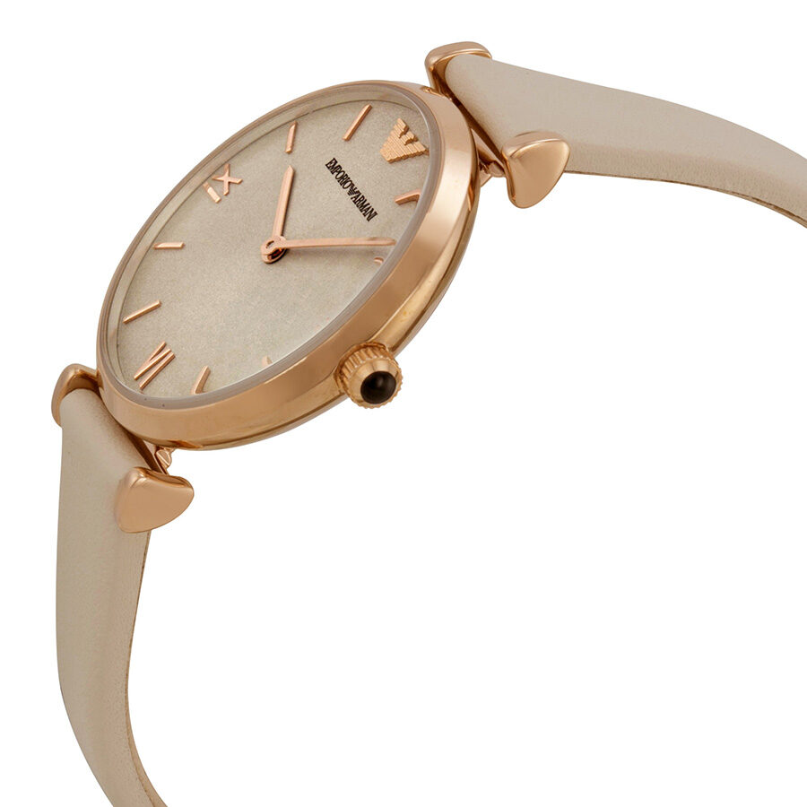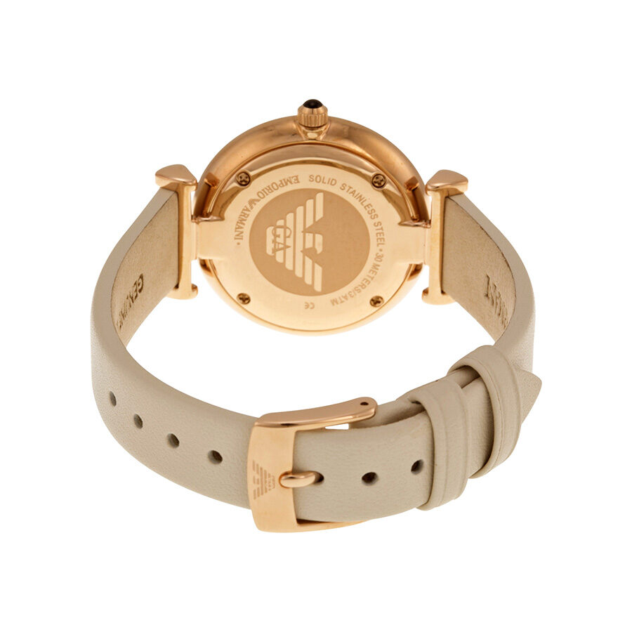 Rose gold-tone stainless steel case with a white leather strap. Fixed rose gold-tone bezel. Light brown dial with rose gold-tone hands and index hour markers. Roman numerals mark the 3, 6, 9 and 12 o'clock positions. The Emporio Armani logo at the 12 o'clock position. Dial Type: Analog. Quartz movement. Scratch resistant mineral crystal. Pull / push crown. Solid case back. Case diameter: 32 mm. Case thickness: 7.5 mm. Round case shape. Band width: 14 mm. Band length: 7.5 inches. Tang clasp. Water resistant at 30 meters / 100 feet. Functions: hour, minute, second. Casual watch style. Emporio Armani Light Brown Dial White Leather Ladies Watch 1769.