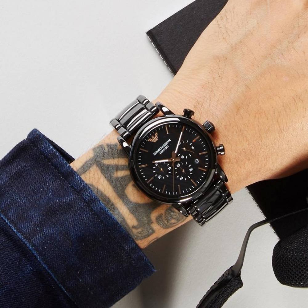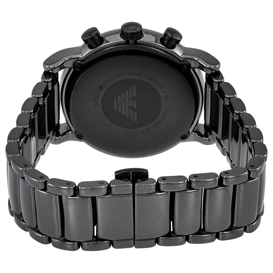 Black ceramic case with a black ceramic bracelet. Fixed black ceramic bezel. Black dial with luminous rose gold-tone hands and index hour markers. Minute markers around the outer rim. Dial Type: Analog. Luminescent hands and markers. Date display between the 4 and 5 o'clock positions. Chronograph - three sub-dials displaying: 60 seconds, 30 minutes, and 24 hours. Quartz movement. Scratch resistant mineral crystal. Push / pull crown. Solid case back. Case size: 43 mm. Case thickness: 11 mm. Round case shape. Band width: 22 mm. Deployment clasp with a push button release. Water resistant at 50 meters / 165 feet. Functions: chronograph, date, hour, minute, second. Additional Info: in general, suitable for short periods of recreational swimming, but not diving or snorkeling. Dress watch style. Emporio Armani Luigi Chronograph Black Dial Men's Watch AR1509