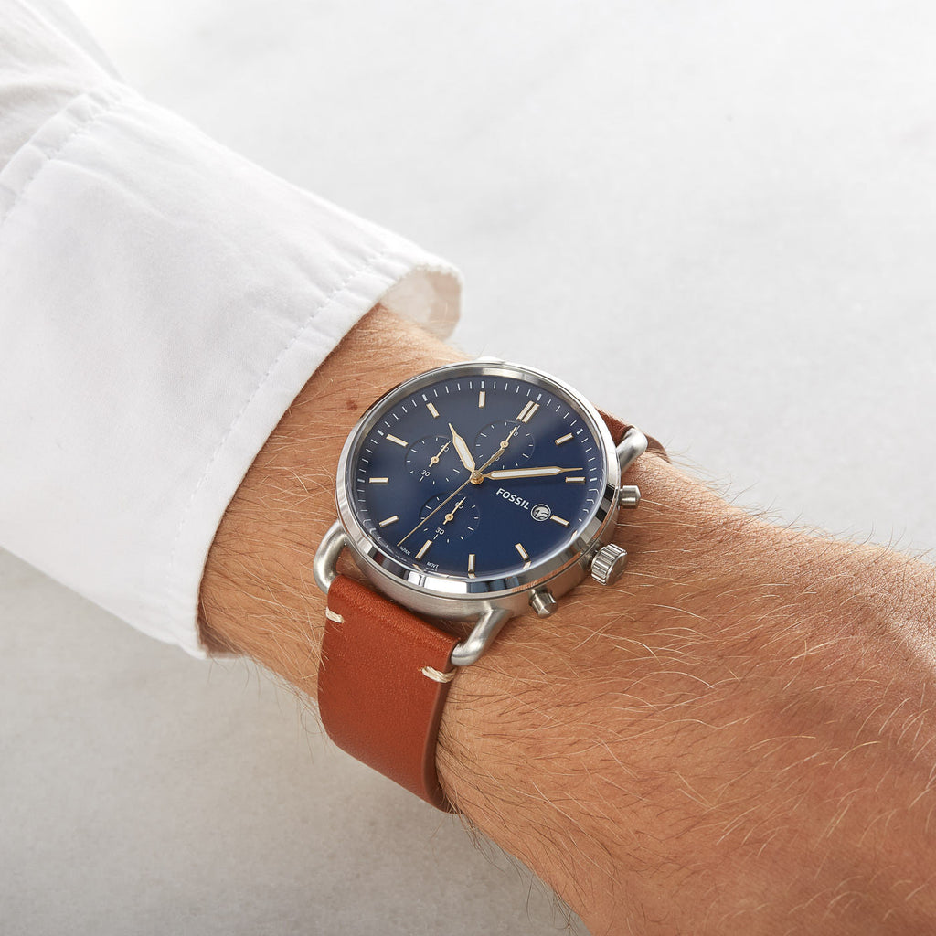 This Fossil Commuter Blue Dial Brown Leather Men's Watch FS5401 comes in stainless steel case with a brown leather strap. Fixed stainless steel bezel. Blue dial with luminous yellow gold-tone hands and index hour markers. Minute markers around the outer rim. Dial Type: Analog. Luminescent hands and markers. Date display at the 3 o'clock position. Chronograph - three sub-dials displaying: 60 second, 60 minute and 1/10th of a second. Quartz movement. Scratch resistant mineral crystal. Pull / push crown. Solid case back. Round case shape. Case size: 42 mm. Case thickness: 11 mm. Band width: 22 mm. Band length: 7.5 inches. Tang clasp. Water resistant at 50 meters / 165 feet. Functions: chronograph, date, hour, minute, second. Casual watch style.
