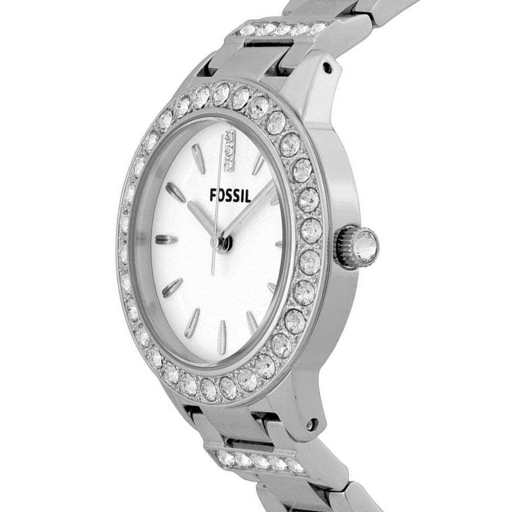 Stainless steel case with a stainless steel bracelet set with crystals. Fixed silver-tone bezel set with crystals. White dial with luminous hands and index hour markers. Crystal-set stick mark at the 12 o'clock position. Dial Type: Analog. Quartz movement. Scratch resistant mineral crystal. Solid case back. Case diameter: 34 mm. Case thickness: 8 mm. Round case shape. Band width: 15 mm. Jewelry clasp. Water resistant at 50 meters / 165 feet. Functions: hours, minutes, seconds. Dress watch style. Fossil Glitz White Dial Stainless Steel Ladies Watch ES2362.