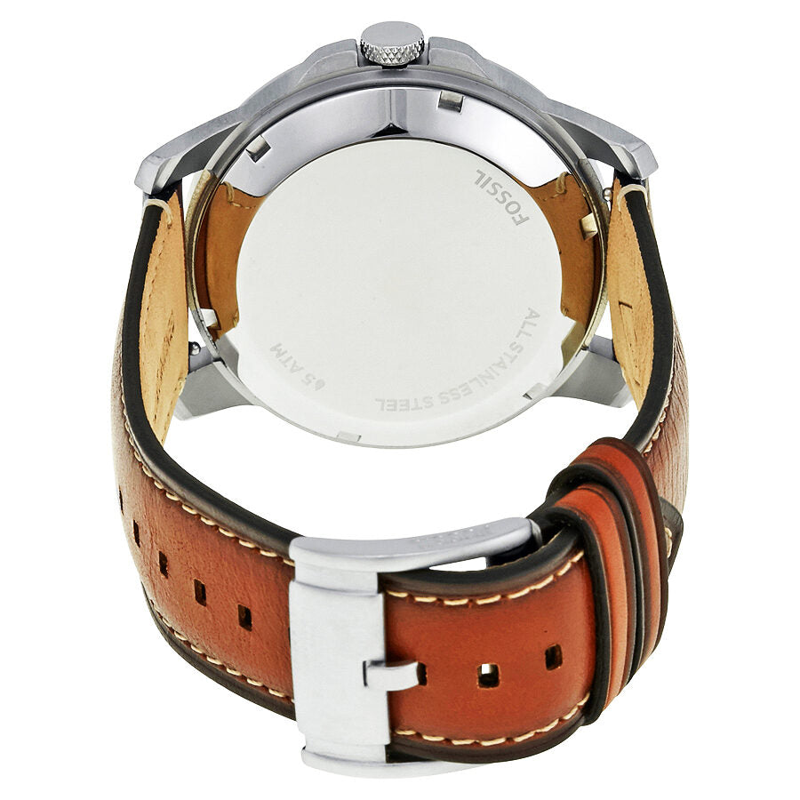 Silver-tone stainless steel case with a brown leather strap. Fixed silver-tone stainless steel bezel. Navy blue dial with luminous silver-tone hands and Roman numeral hour markers. Minute markers around the outer rim. Dial Type: Analog. Luminescent hands and markers. Date display at the 3 o'clock position. Four sub-dials displaying: 60 seconds, date, day of the week, and 30 minutes. Quartz movement. Scratch resistant mineral crystal. Pull / push crown. Solid case back. Round case shape, case size: 44 mm, case thickness: 13 mm. Band width: 22 mm. Tang clasp. Water resistant at 50 meters / 165 feet. Functions: chronograph, date, day of the week, hour, minute, second. Grant Series. Casual watch style. Fossil Grant Chronograph Men's Watch ME1161.