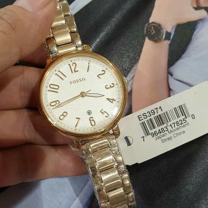 This Fossil Jacqueline Gold Tone Dial Ladies Steel Watch ES3971 comes in gold tone stainless steel case with a gold tone stainless steel bracelet. Fixed bezel. Gold tone dial with gold-tone hands and Arabic numeral hour markers. Dial Type: Analog. Date display at the 6 o'clock position. Quartz movement. Pull / push crown. Solid case back. Case size: 36 mm. Case thickness: 8 mm. Round case shape. Band width: 14 mm. Deployment with push button clasp. Water resistant at 30 meters / 100 feet. Functions: date, hour, minute, second. Casual watch style.