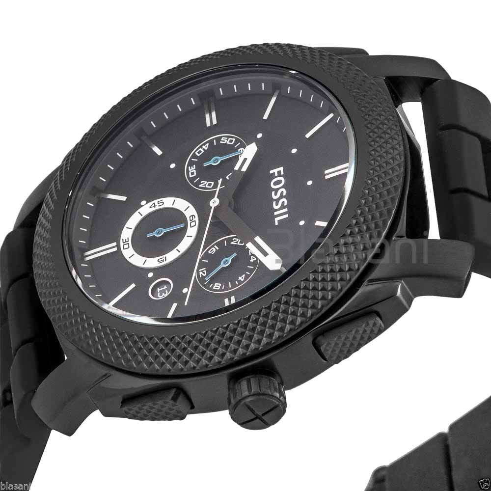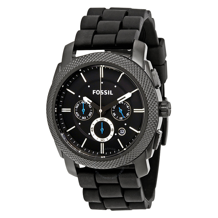 This Fossil Machine Chronograph Black Dial Silicone Strap Men's Watch FS4487 comes in black ion-plated stainless steel case with a black silicone strap. Fixed black ion-plated bezel. Black dial with black hands and index hour markers. Minute markers around the outer rim. Dial Type: Analog. Luminescent hands and markers. Date display between the 4 and 5 o'clock positions. Chronograph - three sub-dials displaying: 60 second, 60 minute and 24 hour. Quartz movement. Scratch resistant mineral crystal. Pull / push crown. Solid case back. Case size: 45 mm. Case thickness: 13 mm. Round case shape. Band width: 24 mm. Band length: 8 inches. Tang clasp. Water resistant at 50 meters / 165 feet. Functions: chronograph, date, hour, minute, second. Additional Info: suitable for swimming and showering. Casual watch style.