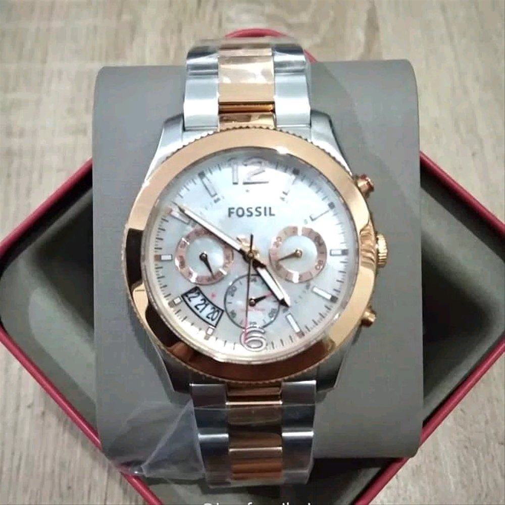 This Fossil Perfect Boyfriend Mother Of Pearl Dial Ladies Watch ES4135 comes in silver-tone stainless steel case with a two-tone (rose gold-tone and silver -tone) stainless steel bracelet. Fixed rose gold-tone stainless steel bezel. White mother of pearl dial with rose gold-tone hands and index-Arabic numerals hour markers. Dial Type: Analog. Date display between 7 and 8 o'clock position. Three- day of the week, 24 hours, 24 hours (dual time) subdials. Quartz movement. Scratch resistant mineral crystal. Pull / push crown. Solid case back. Case size: 39 mm. Case thickness: 11 mm. Round case shape. Band width: 20 mm. Water resistant at 50 meters / 165 feet. Functions: date, hour, minute, second, dual time. Dress watch style.