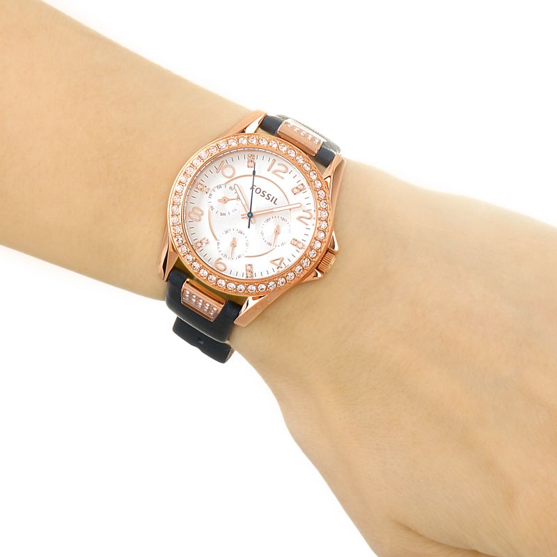 Fossil Riley Silver Dial Blue Leather Strap Ladies Watch ES3887