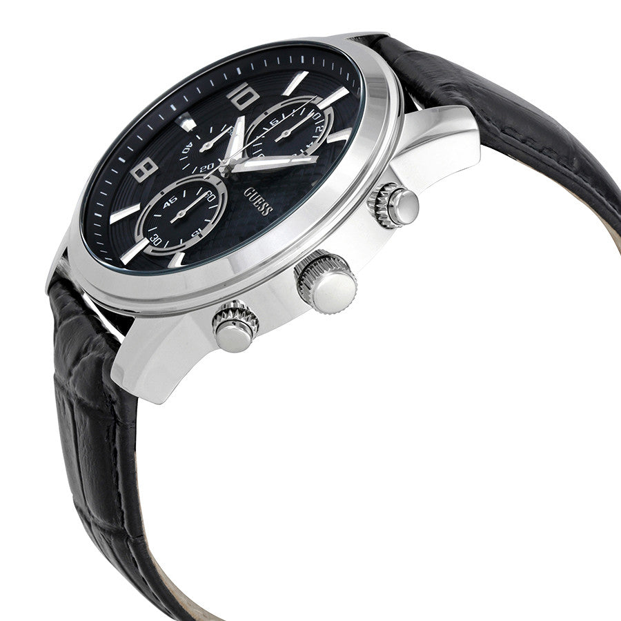 This Guess Black Chronograph Dial Men's Watch W0076G1 comes in silver-tone stainless steel case with a black leather strap. Fixed silver-tone stainless steel bezel. Black dial with silver-tone hands and index-Arabic numerals hour markers. Dial Type: Analog. Luminescent hands and markers. Date display at the 3 o'clock position. Chronograph - sub-dials displaying: three - 60 second, 60 minute and 1/20th of a second. Quartz movement. Solid case back. Case size: 44 mm. Case thickness: 13 mm. Round case shape. Water resistant at 30 meters / 100 feet. Functions: chronograph, date, hour, minute, second. Dress watch style.