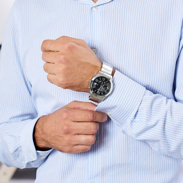 This Guess Black Dial Silver-Tone Stainless Steel Men's Watch W0668G3 comes in brushed and polished silver case, sunray black chrono dial, brushed and polished silver bracelet.