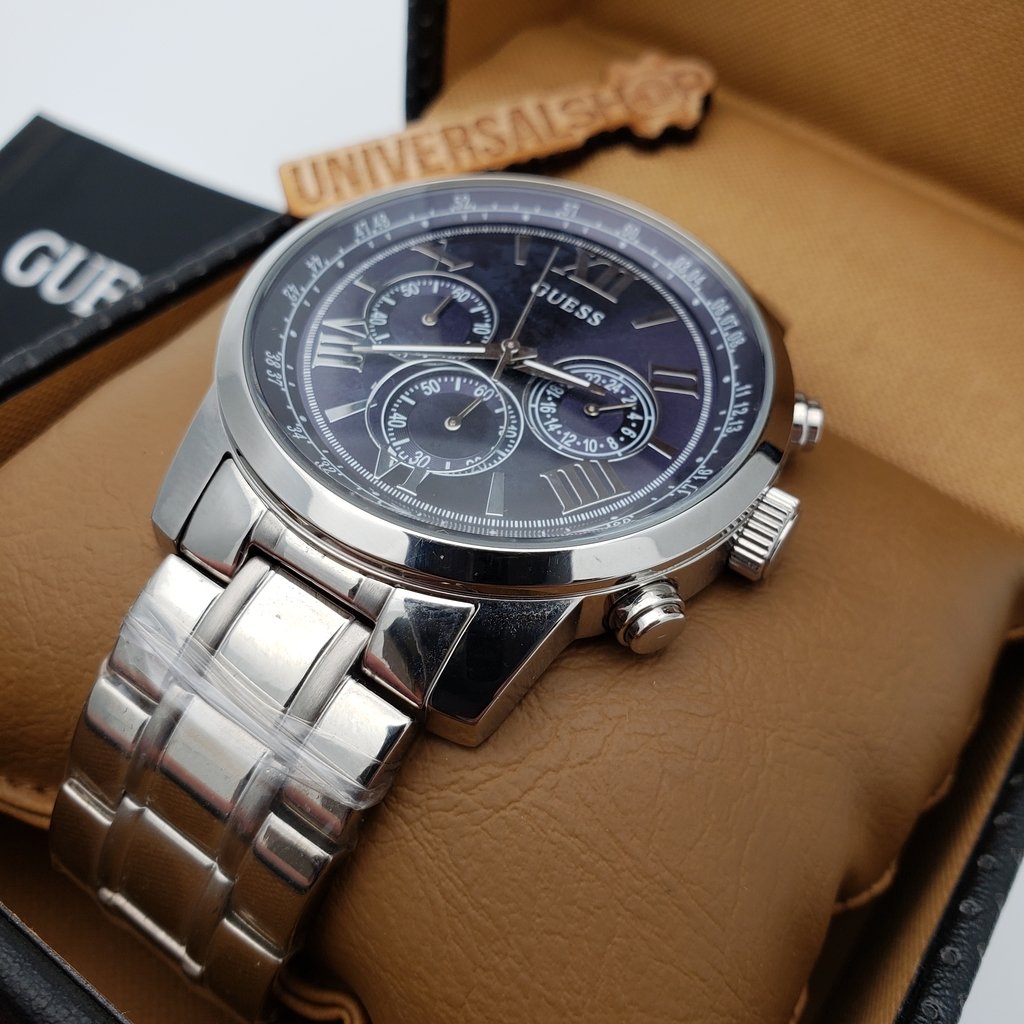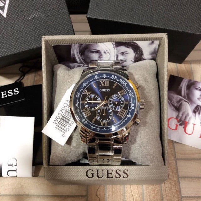 This Guess Horizon Chronograph Blue Dial Men's Watch W0379G3 is a really handsome Gents watch. The case is Stainless Steel, which stands for a high quality item and the blue dial gives the watch a unique look. The features of the watch include (among others) a chronograph. In regards to the water resistance, the watch is resistant up to 50 metres. It means it can be submerged in water for periods, so can be used for swimming and fishing. However, it is not recommended for high impact water sports.