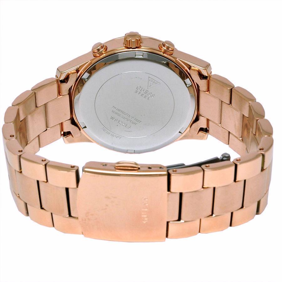 This Guess Mini Spectrum Rose Gold-Tone Stainless Steel Ladies Watch W0122L3 comes in rose gold-tone stainless steel case. Rose gold-tone bracelet. Rose gold-tone dial. Quartz movement. Date. Chronograph. Water resistant 50 meters. Case 38mm.