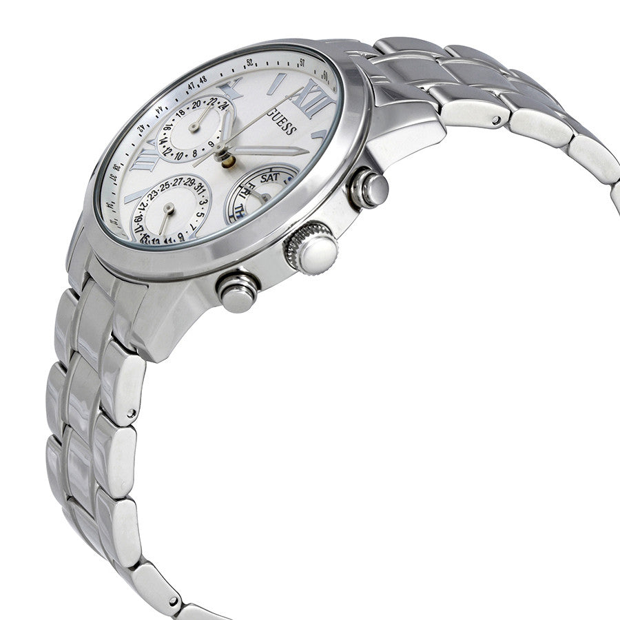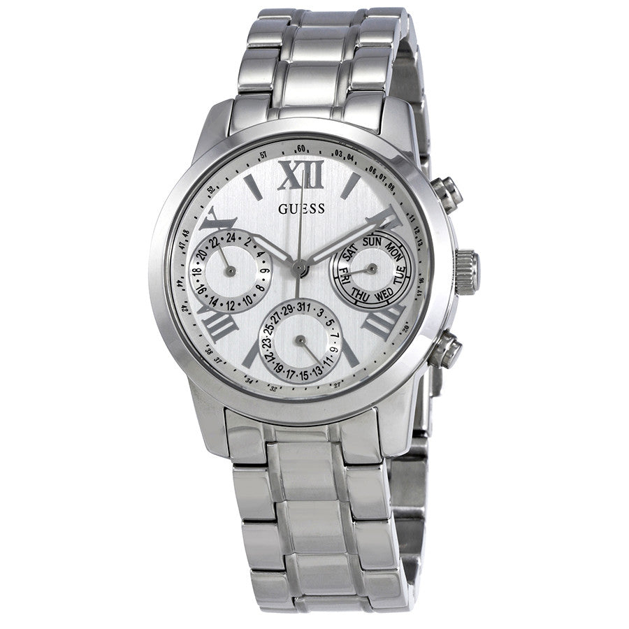 This Guess Mini Sunrise Silver Dial Ladies Watch W0448L1 comes in stainless steel case with a stainless steel bracelet. Fixed stainless steel bezel. Silver dial with luminous silver-tone hands and Roman numeral and index hour markers. Minute markers around the outer rim. Dial Type: Analog. Luminescent hands. Three multi-function sub-dials displaying: 24 hour, date and day of the week. Quartz movement. Scratch resistant synthetic sapphire crystal. Pull / push crown. Solid case back. Case size: 36 mm. Case thickness: 10 mm. Round case shape. Band width: 20 mm. Fold over deployment clasp. Water resistant at 50 meters / 165 feet. Casual watch style.