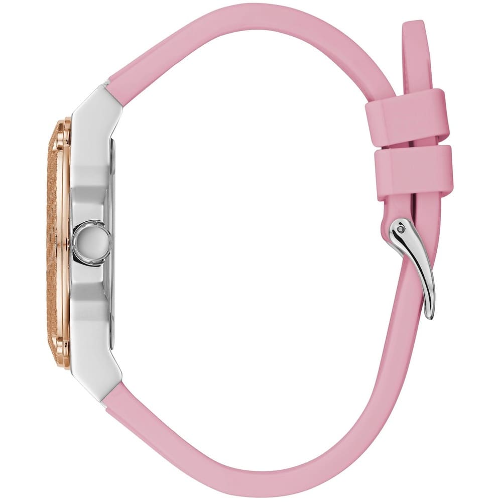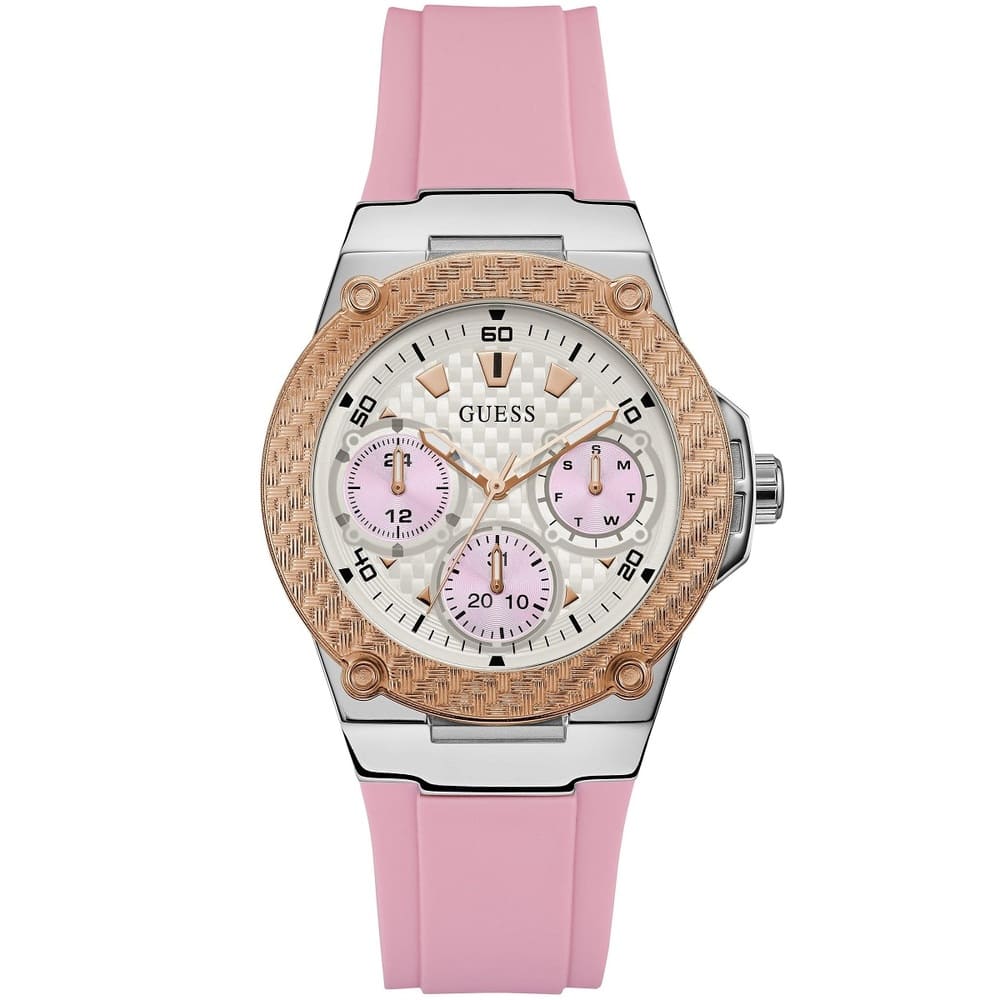 Stainless steel case with a pink silicone strap. Fixed rose gold-tone bezel. Silver dial with luminous rose gold-tone hands and index hour markers. Minute markers around the outer rim. Dial Type: Analog. Luminescent hands. Three multi-function sub-dials displaying: 24 hour, date and day of the week. Quartz movement. Scratch resistant mineral crystal. Solid case back. Round case shape. Case size: 40 mm. Case thickness: 10 mm. Band width: 20 mm. Tang clasp. Water resistant at 50 meters / 165 feet. Functions: date, day, hour, minute, second. Sport watch style. Watch label: Japan Movt. Guess Zena Quartz Silver Dial Ladies Watch W1094L4.