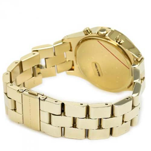 Gold-plated stainless steel case and bracelet. Fixed gold-plated bezel set with crystals. Champagne dial with black hands and BY MARC JACOBS hour markers. Dial Type: Analog. Date display between 4 and 5 o'clock positions. Chronograph - three sub-dials displaying: 60 second, 60 minute and 24 hour. Quartz movement. Scratch resistant mineral crystal. Pull / push crown. Solid case back. Case diameter: 36 mm. Case thickness: 13 mm. Round case shape. Band width: 18 mm. Band length: 7.45 inches. Deployment clasp. Water resistant at 50 meters / 165 feet. Functions: chronograph, date, hour, minute, second. Casual watch style. Marc by Marc Jacobs Henry Chronograph Champagne Dial Gold-plated Ladies Watch MBM3105.