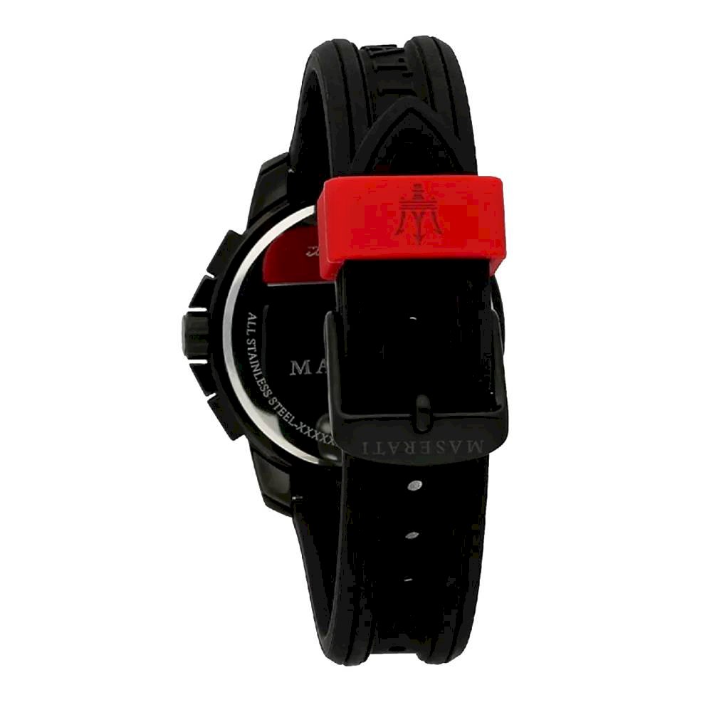 Silver-tone stainless steel case with a black rubber strap. Fixed black stainless steel bezel. Black dial with silver-tone hands and index hour markers. Minute markers around the outer rim. Dial Type: Analog. Chronograph - three sub-dials displaying: 60 second, 12 hour, 24 hour. Quartz movement. Scratch resistant mineral crystal. Pull / push crown. Round case shape. Case size: 44 mm. Water resistant at 50 meters / 165 feet. Functions: chronograph, hour, minute, second. Sport watch style. Maserati Sfida Chronograph Black Dial Men's Watch R8851123007.