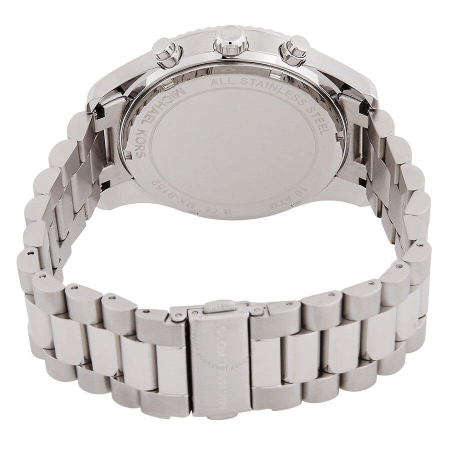 Silver-tone stainless steel case and bracelet. Fixed silver-tone stainless steel bezel. Green dial with silver-tone hands and index-Roman numeral hour markers. Minute markers around the outer rim. Dial Type: Analog. Date display between 4 and 5 o'clock position. Chronograph - three sub-dials displaying: 60 second, 30 minute and 24 hour. Quartz movement. Scratch resistant mineral crystal. Pull / push crown. Solid case back. Round case shape, case size: 44 mm. Band width: 22 mm. Fold over clasp with a safety release. Water resistant at 100 meters / 330 feet. Functions: chronograph, date, hour, minute, second. Lexington Series. Sport watch style. Michael Kors Lexington Chronograph Quartz Green Dial Men's Watch MK9152.