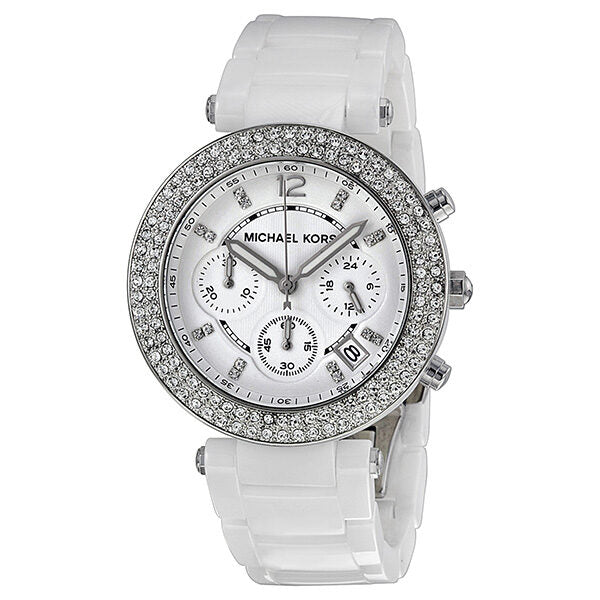 Stainless steel case with a white ceramic bracelet. Fixed silver-tone bezel set with crystals. White dial with silver-tone hands and crystal index hour markers. Arabic numeral marks the 12 o'clock position. Minute markers around the outer rim. Dial Type: Analog. Luminescent hands and markers. Date display between the 4 and 5 o'clock positions. Chronograph - three sub-dials displaying: 60 second, 60 minute and 12 hours. Quartz movement. Scratch resistant mineral crystal. Solid case back. Case diameter: 39 mm. Case thickness: 13 mm. Round case shape. Band width: 25 mm. Deployment clasp with push button. Water resistant at 50 meters / 165 feet. Functions: chronograph, date, hour, minute, second. Dress watch style. Michael Kors Parker Chronograph White Ceramic Ladies Watch MK5654.