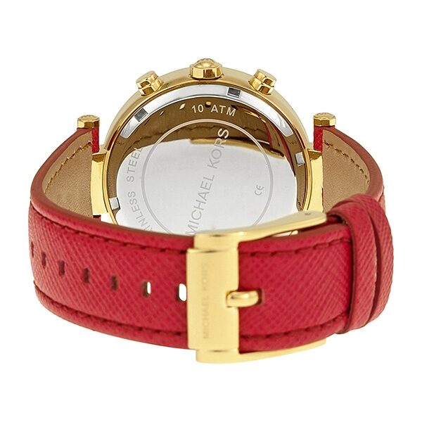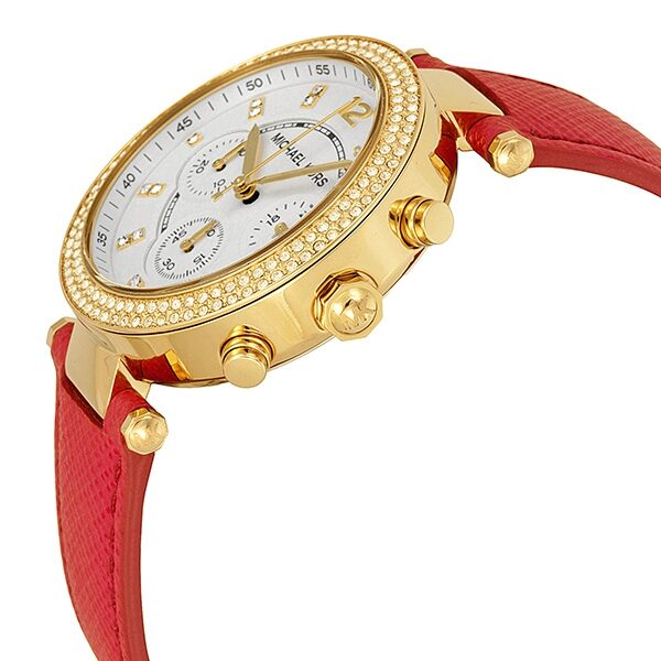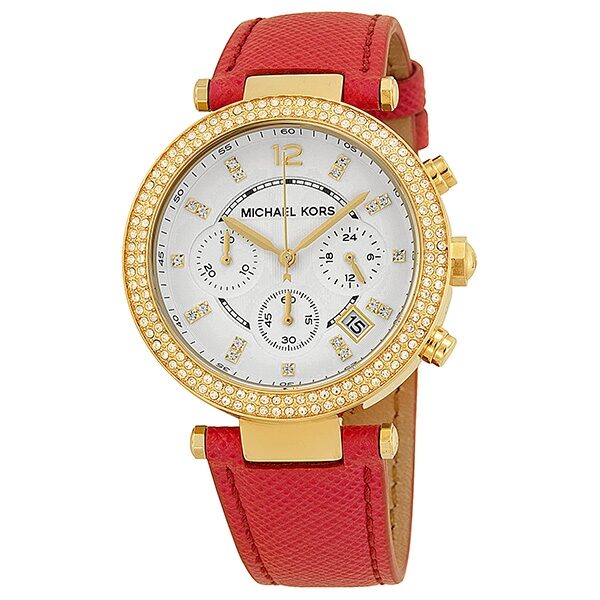 Stainless steel case with a pink leather strap. Fixed gold-tone bezel set with two rows of crystals. White dial with luminous gold-tone hands and crystal index hour markers. Minute markers around the outer rim. Dial Type: Analog. Luminescent hands. Date display between 4 and 5 o'clock positions. Chronograph - three sub-dials displaying: 60 seconds, 30 minutes, and 24 hours. Quartz movement. Scratch-resistant mineral crystal. Solid case back. Case diameter: 39 mm. Case thickness: 12 mm. Round case shape. Band width: 21 mm. Tang clasp. Water-resistant at 100 meters / 330 feet. Functions: chronograph, date, hour, minute, second. Casual watch style. Michael Kors Parkers Chronograph White Dial Pink Leather Ladies Watch MK2297.