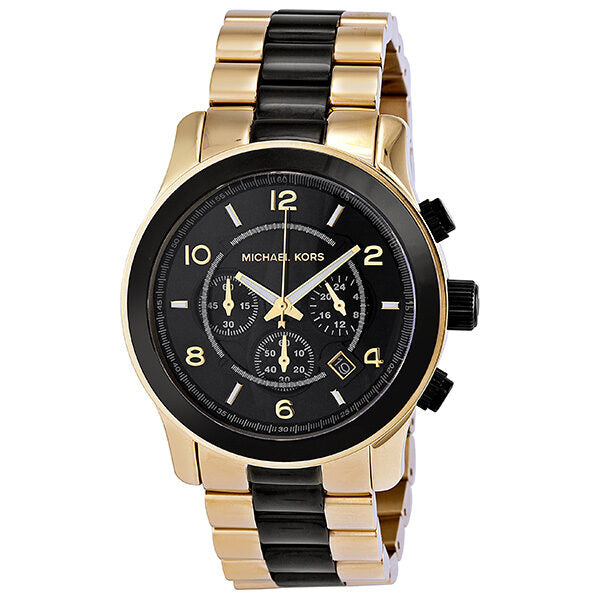This Michael Kors Runway Chronograph Black Dial Gold-Tone Men's Watch MK8265 comes in stainless steel case with a two-tone (black and gold-tone) stainless steel bracelet. Fixed black ion-plated bezel. Black dial with gold-tone hands and alternating stick and Arabic numeral hour markers. Minute markers around the outer rim. Dial Type: Analog. Luminescent hands and markers. Date display appears between the 4 and 5 o'clock positions. Chronograph - three sub-dials displaying: 60 second, 60 minute and 24 hour. Quartz movement. Scratch resistant mineral crystal. Solid case back. Case diameter: 45 mm. Case thickness: 15 mm. Round case shape. Band width: 24 mm. Deployment clasp with push button release. Water resistant at 100 meters / 330 feet. Functions: chronograph, date, hour, minute, second.