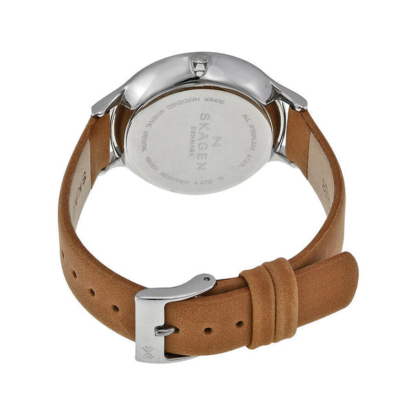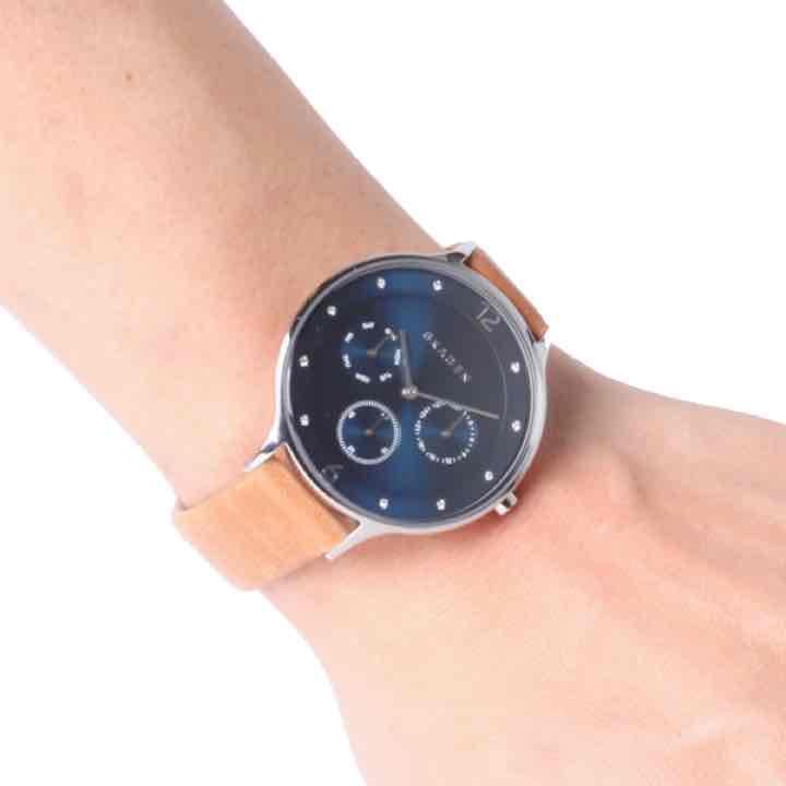 This Skagen Anita Multi-Function Blue Dial Ladies Watch SKW2310 comes in stainless steel case with a tan leather strap. Fixed stainless steel bezel. Blue dial with silver-toned hands and crystal hour markers. Arabic numerals mark the 6 and 12 o'clock positions. Dial Type: Analog. Three multi-function sub-dials displaying: 60 second, day of the week and date. Quartz movement. Scratch resistant mineral crystal. Pull / push crown. Solid case back. Case diameter: 36 mm. Case thickness: 9 mm. Round case shape. Band width: 14 mm. Tang clasp. Water resistant at 30 meters / 100 feet. Functions: hour, minute, second, calendar. Casual watch style.