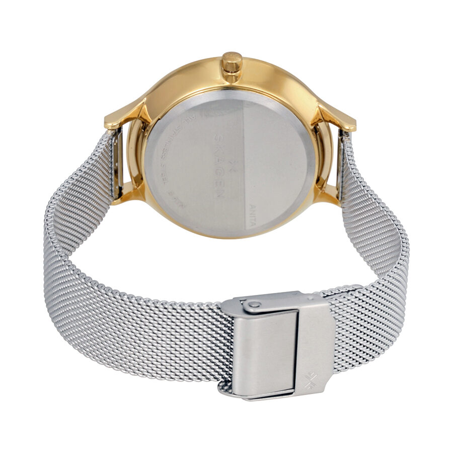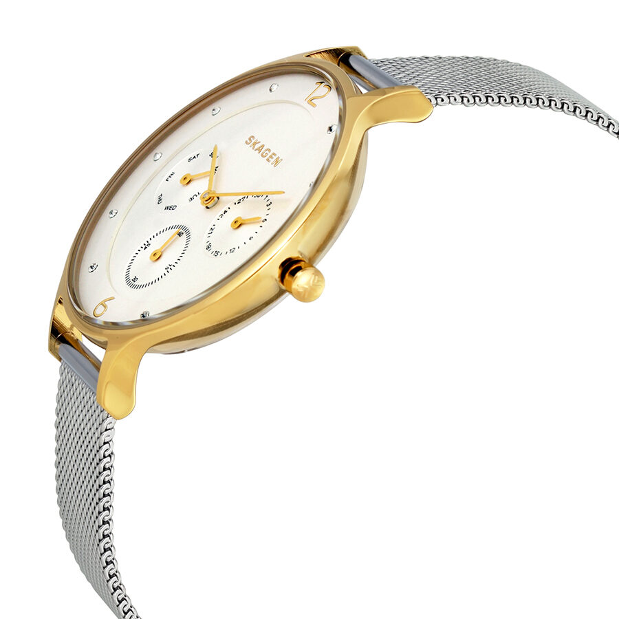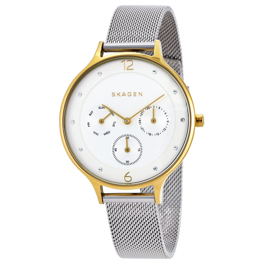 Gold-tone stainless steel case with a stainless steel mesh bracelet. Fixed gold-tone bezel. Silver dial with gold-tone hands and crystal hour markers. Arabic numerals mark the 6 and 12 o'clock positions. Dial Type: Analog. Date display at the 3 o'clock position. Three multi-function sub-dials displaying: 60 seconds, date, and day of the week. Quartz movement. Scratch resistant mineral crystal. Pull / push crown. Solid case back. Case size: 36 mm. Round case shape. Band width: 14 mm. Deployment clasp with push button release. Water resistant at 30 meters / 100 feet. Functions: date, day, hour, minute, second. Casual watch style. Skagen Anita Multifunction Silver Dial Unisex Watch SKW2400.