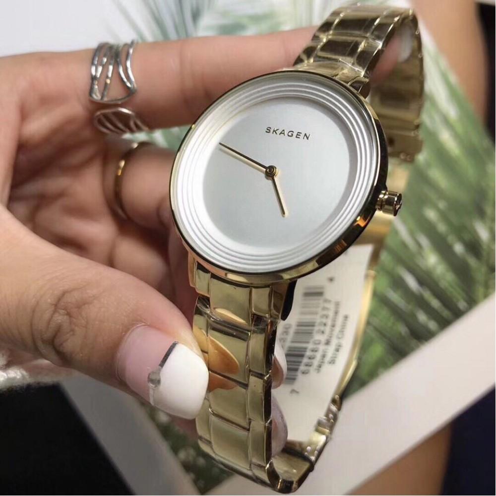 This Skagen Ditte Silver Dial Gold-Tone Stainless Steel Ladies Watch SKW2330 comes in gold-tone stainless steel case and bracelet. Fixed gold-tone bezel. Silver sandblast dial with gold-tone hands. No markers. Dial Type: Analog. Quartz movement. Scratch resistant mineral crystal. Pull / push crown. Solid case back. Case diameter: 36.5 mm. Case thickness: 7 mm. Round case shape. Band width: 18 mm. Fold over clasp. Water resistant at 30 meters / 100 feet. Functions: hour, minute. Casual watch style.