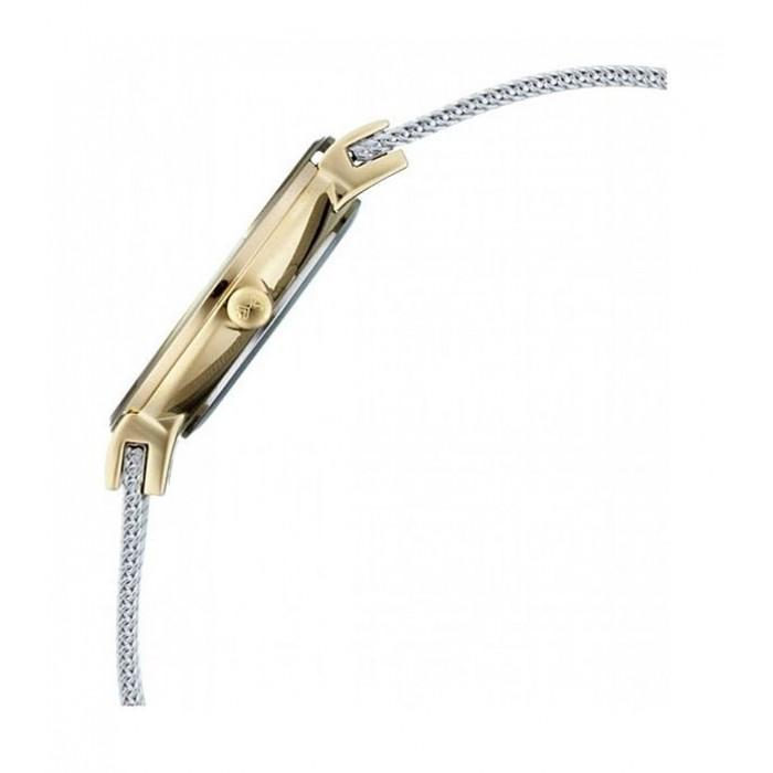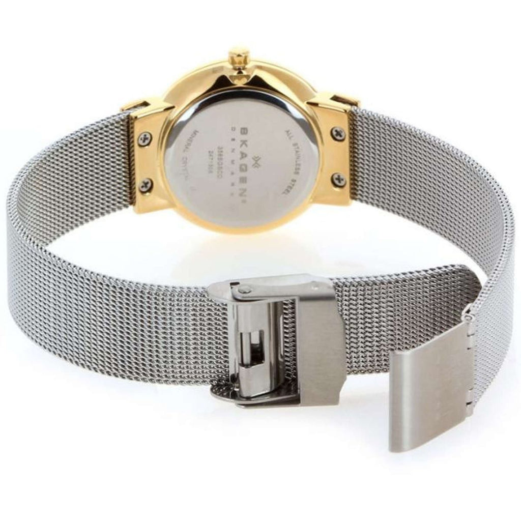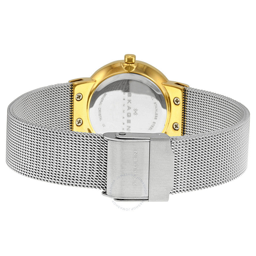 This Skagen Freja Silver Dial Stainless Steel Mesh Ladies Watch 358SGSCD comes in gold-plated stainless steel case with a stainless steel mesh bracelet. Fixed gold-plated bezel. Silver white dial with gold-tone hands and swarovski crystal hour markers. Dial Type: Analog. Quartz movement. Scratch resistant mineral crystal. Pull / push crown. Solid case back. Case size: 26 mm. Case thickness: 5.74 mm. Round case shape. Band width: 14 mm. Fold over clasp. Water resistant at 30 meters / 100 feet. Functions: hour, minute. Additional Info: in general, withstands splashes or brief immersion in water, but not suitable for swimming. Casual watch style.