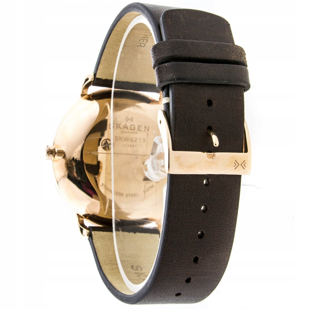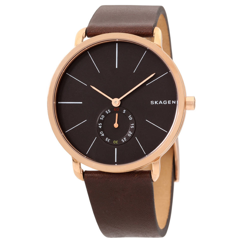 This Skagen Hagen Brown Leather Watch SKW6213 comes in rose gold-tone stainless steel case with a brown leather strap. Fixed rose gold-tone bezel. Brown/grey dial with rose gold-tone hands and index hour markers. Dial Type: Analog. Small seconds sub-dial above the 6 o'clock position. Quartz movement. Scratch resistant mineral crystal. Pull / push crown. Solid case back. Case diameter: 40 mm. Case thickness: 8 mm. Round case shape. Band width: 20 mm. Band length: 9 inches. Tang clasp. Water resistant at 50 meters / 165 feet. Functions: hour, minute, second. Casual watch style.
