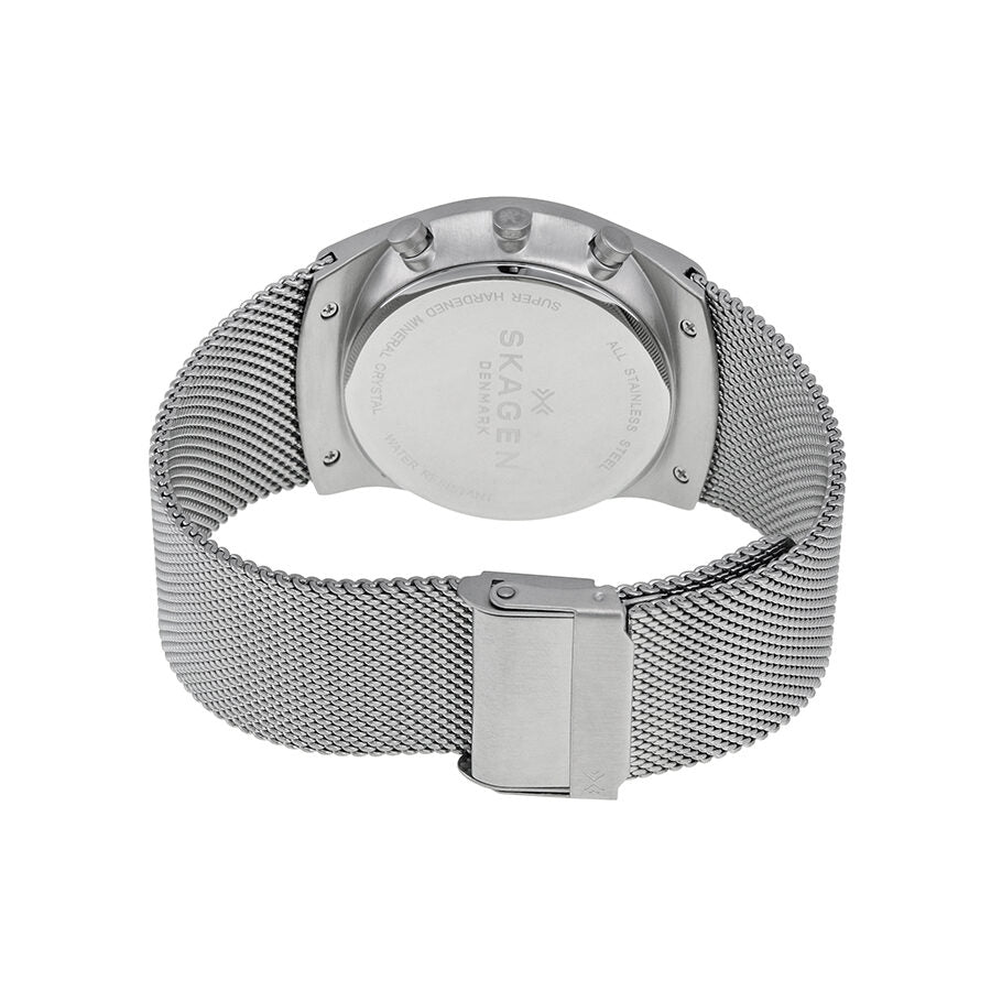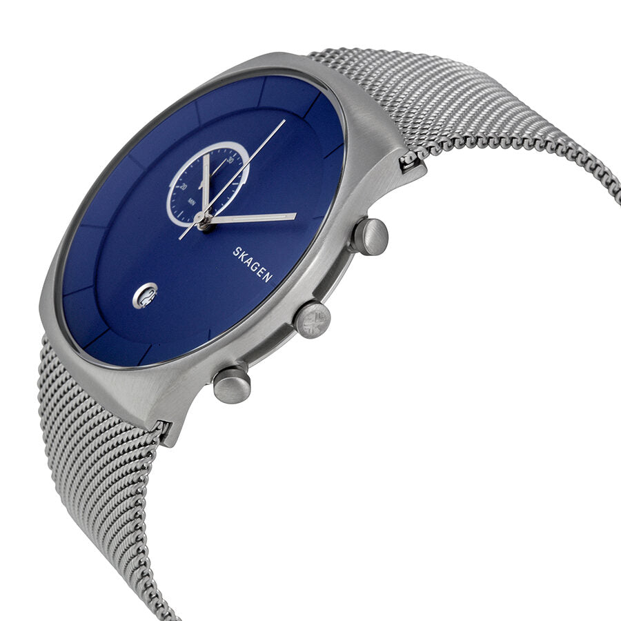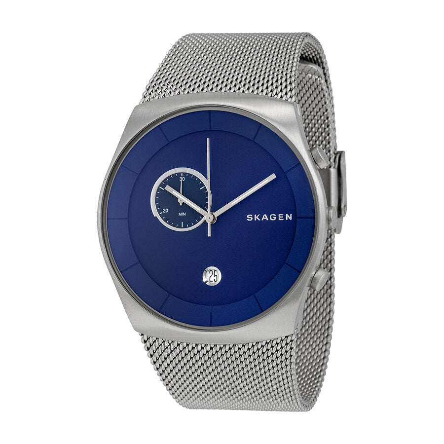 Stainless steel case with a stainless steel mesh bracelet. Fixed stainless steel bezel. Blue dial with silver-tone hands and index hour markers. Dial Type: Analog. Date display above the 6 o'clock position. 30 minute sub-dial at the 10 o'clock position. Quartz movement. Scratch resistant mineral crystal. Pull / push crown. Solid case back. Case diameter: 42 mm. Case thickness: 10 mm. Round case shape. Band width: 30 mm. Water resistant at 50 meters / 165 feet. Functions: chronograph, date, hour, minute, second. Casual watch style. Skagen Havene Chronograph Blue Dial Stainless Steel Mesh Bracelet Men's Watch SKW6185.
