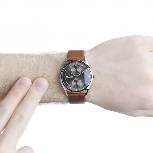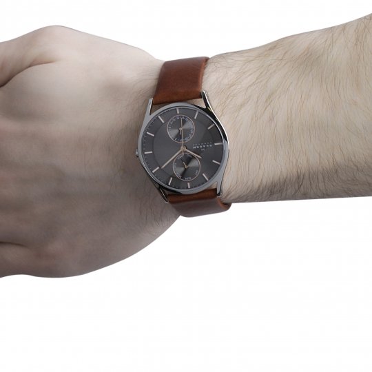 This Skagen Holst Charcoal Dial Brown Leather Men's Watch SKW6086 comes in stainless steel case with a brown leather strap. Fixed stainless steel bezel. Charcoal dial with luminous rose gold-tone hands and index hour markers. Minute markers around the outer rim. Dial Type: Analog. Two sub-dials displaying: day of the week and date. Quartz movement. Scratch resistant mineral crystal. Pull / push crown. Solid case back. Round case shape, case size: 40 mm, case thickness: 9 mm. Band width: 20 mm. Tang clasp. Water resistant at 50 meters / 165 feet. Functions: date, day, hour, minute, second. Additional Info: in general, suitable for short periods of recreational swimming, but not diving or snorkeling. Casual watch style.