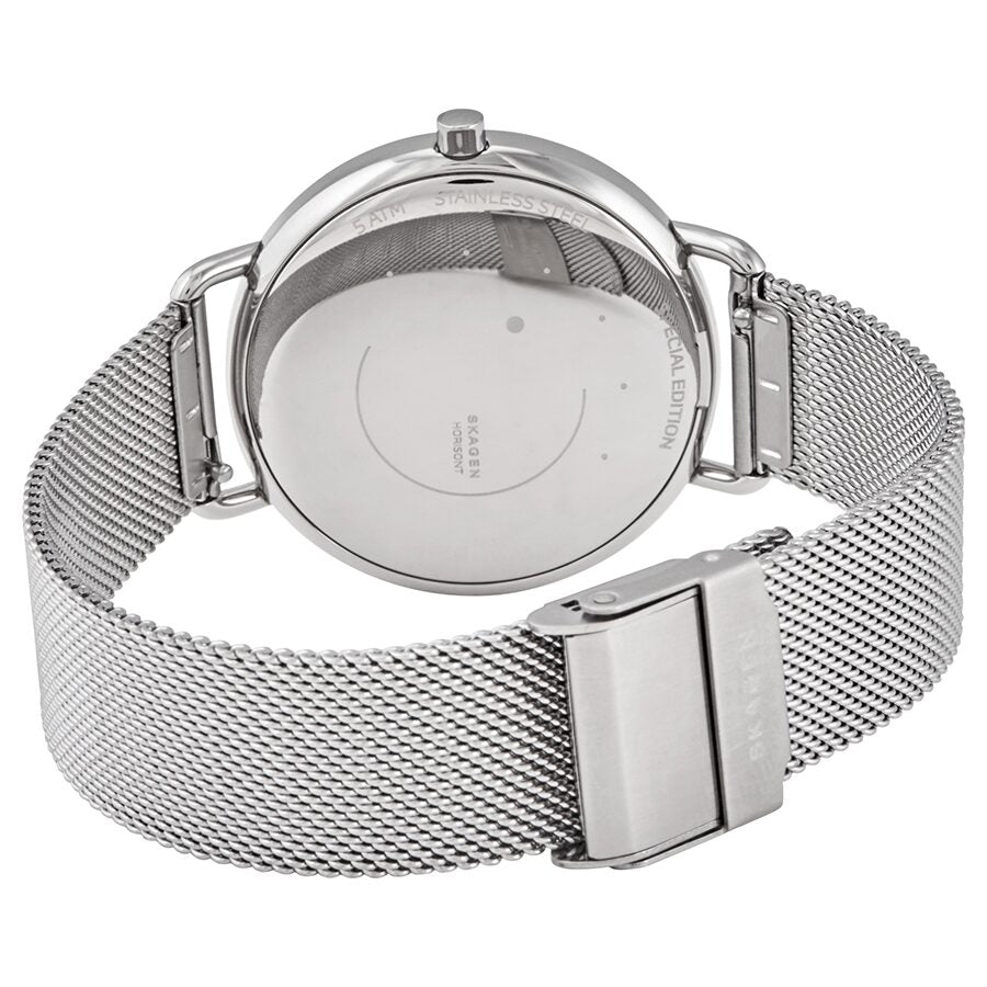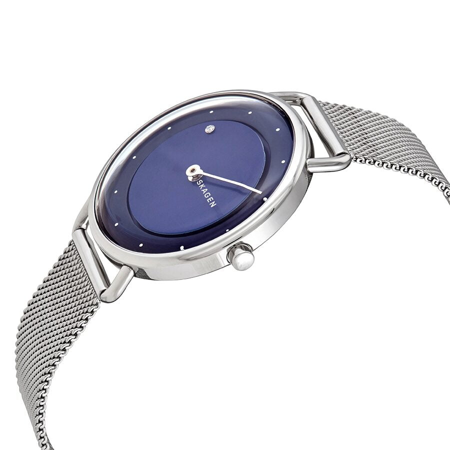 Stainless steel case with a stainless steel mesh bracelet. Fixed stainless steel bezel. Blue dial with silver-tone hands and dot hour markers. A single diamond is set at the 10 o'clock position. Dial Type: Analog. Quartz movement. Scratch resistant mineral crystal. Pull / push crown. Solid case back. Round case shape. Case size: 36 mm. Case thickness: 5 mm. Band width: 16 mm. Slip through clasp. Water resistant at 50 meters / 165 feet. Functions: hour, minute. Dress watch style. Skagen Horizont Rotating Diamond Quartz Blue Dial Ladies Watch SKW2738.
