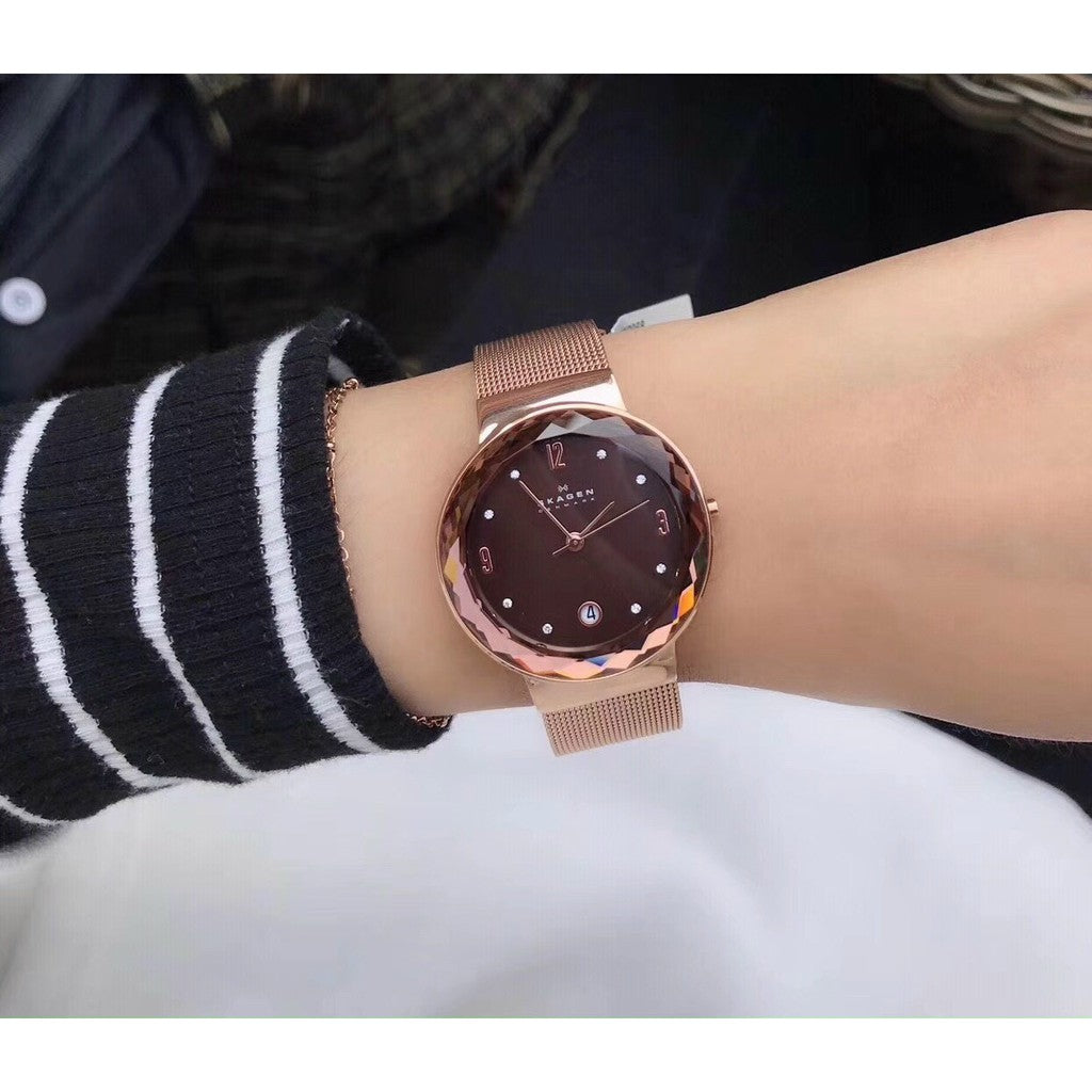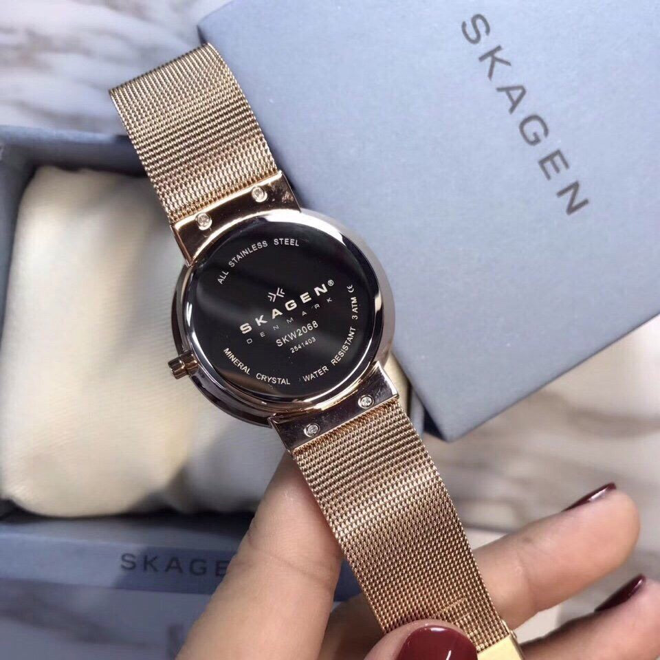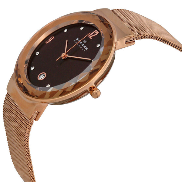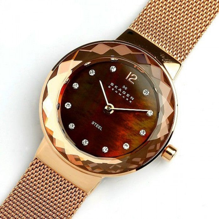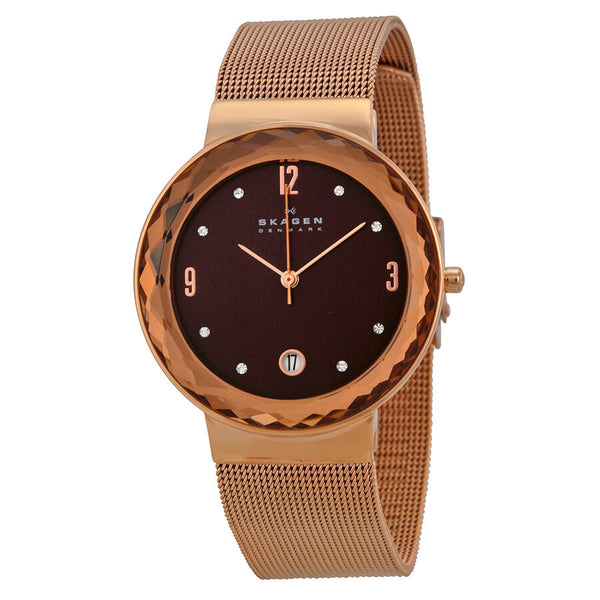 This Skagen Klassik Rose Gold-plated Mesh Bracelet Ladies Watch SKW2068 comes in rose gold-plated stainless steel case with a rose gold-plated stainless steel mesh bracelet. Fixed mirrored rose gold-plated bezel. Brown dial with rose gold-tone hands and crystal hour markers. Arabic numerals mark the 3, 9 and 12 o'clock positions. Dial Type: Analog. Date display at the 6 o'clock position. Quartz movement. Scratch resistant mineral crystal. Pull / push crown. Solid case back. Case diameter: 34.5 mm. Case thickness: 8.3 mm. Round case shape. Band width: 18 mm. Box safety clasp. Water resistant at 30 meters / 100 feet. Functions: date, hour, minute, second. Casual watch style.