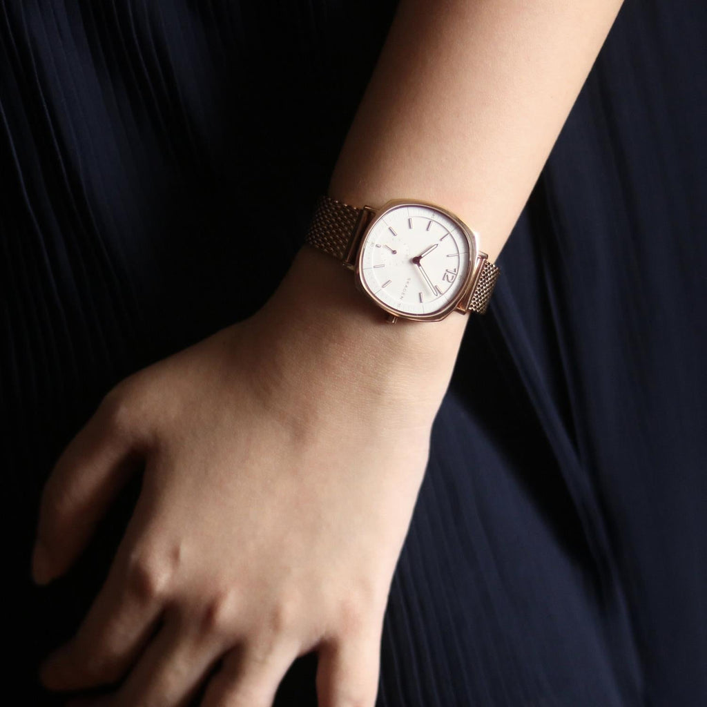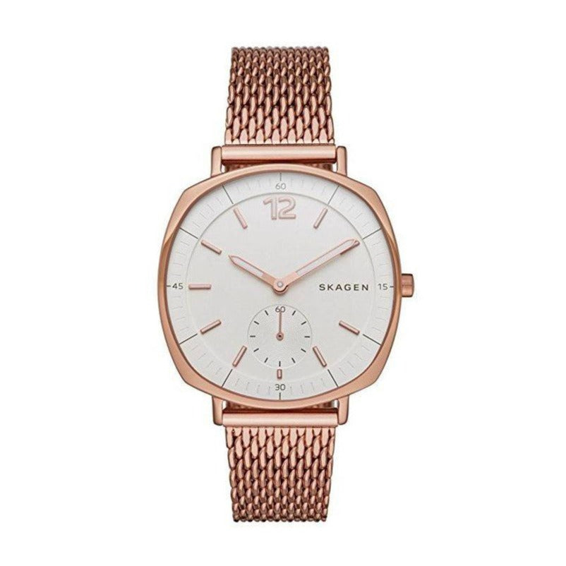 This Skagen Rungsted White Dial Rose Gold Tone Ladies Watch SKW2401 comes in rose gold-tone stainless steel case with a rose gold-tone stainless steel mesh bracelet. Fixed bezel. White dial with rose gold-tone hands and index- Arabic at the 12 o' clock hour markers. Minute markers around the outer rim. Dial Type: Analog. Luminescent hands and markers. One- 60 seconds. Quartz movement. Scratch resistant mineral crystal. Pull / push crown. Solid case back. Case diameter: 34 mm x39 mm. Square case shape. Band width: 16 mm. Deployment with push button clasp. Water resistant at 50 meters / 165 feet. Functions: hour, minute, second. Dress watch style.